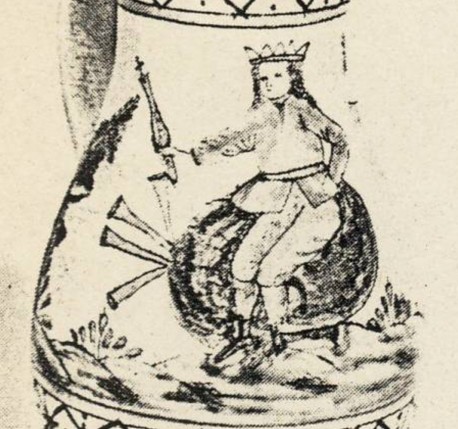 Krug aus Keramik. Gmunden, OÖ. um 1820. Aus: König-Hollweger, Lotte und Franz: Bildzeugnisse zum Dudelsack auf Gmundner Fayencen. In: Jahrbuch des Österreichischen Volksliedwerkes. Bd. 32, 1986, S. 116 <1820>