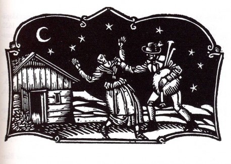 Illustration zur Dudelsackpfeifer-Ballade. Konrad Mautner. Aus: Mautner, Konrad: Alte Lieder und Weisen aus dem steyermärkischen Salzkammergut. Graz, 1919, S. 69
